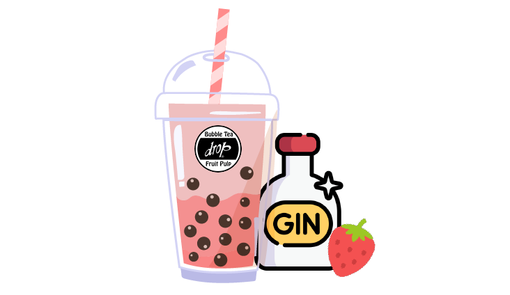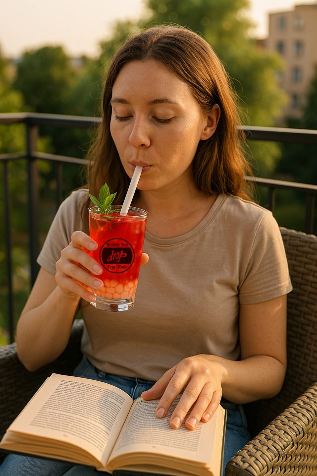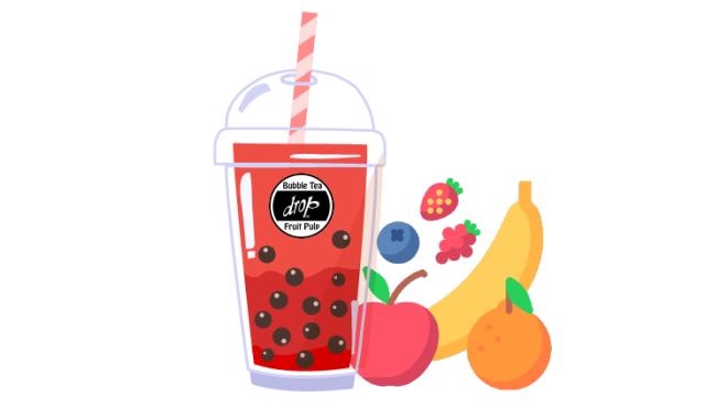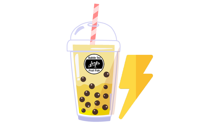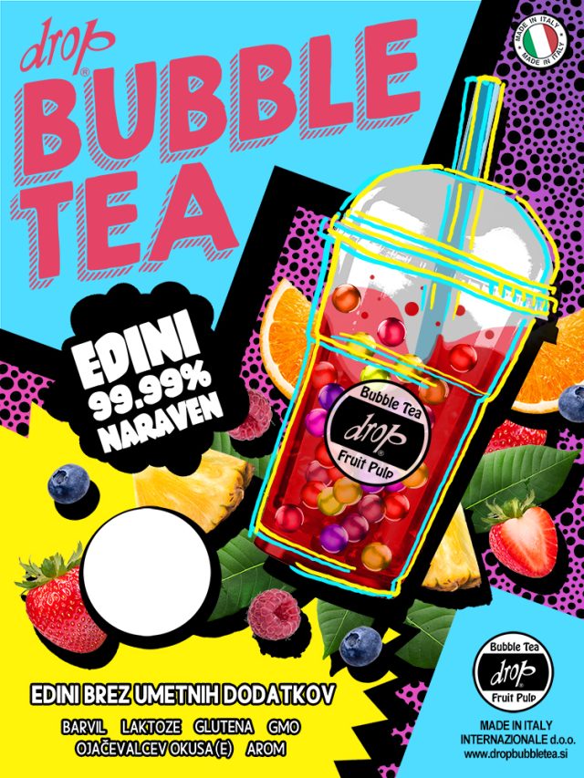 Naš DROP BUBBLE TEA je unikaten, saj je sestavljen iz čaja (črnega ali zelenega, z nizko vsebnostjo teina), sadnih kaš in obogaten z naravnimi in veganskimi kroglicami (»boba«) narejenimi iz alg in drugih naravnih sestavin.
